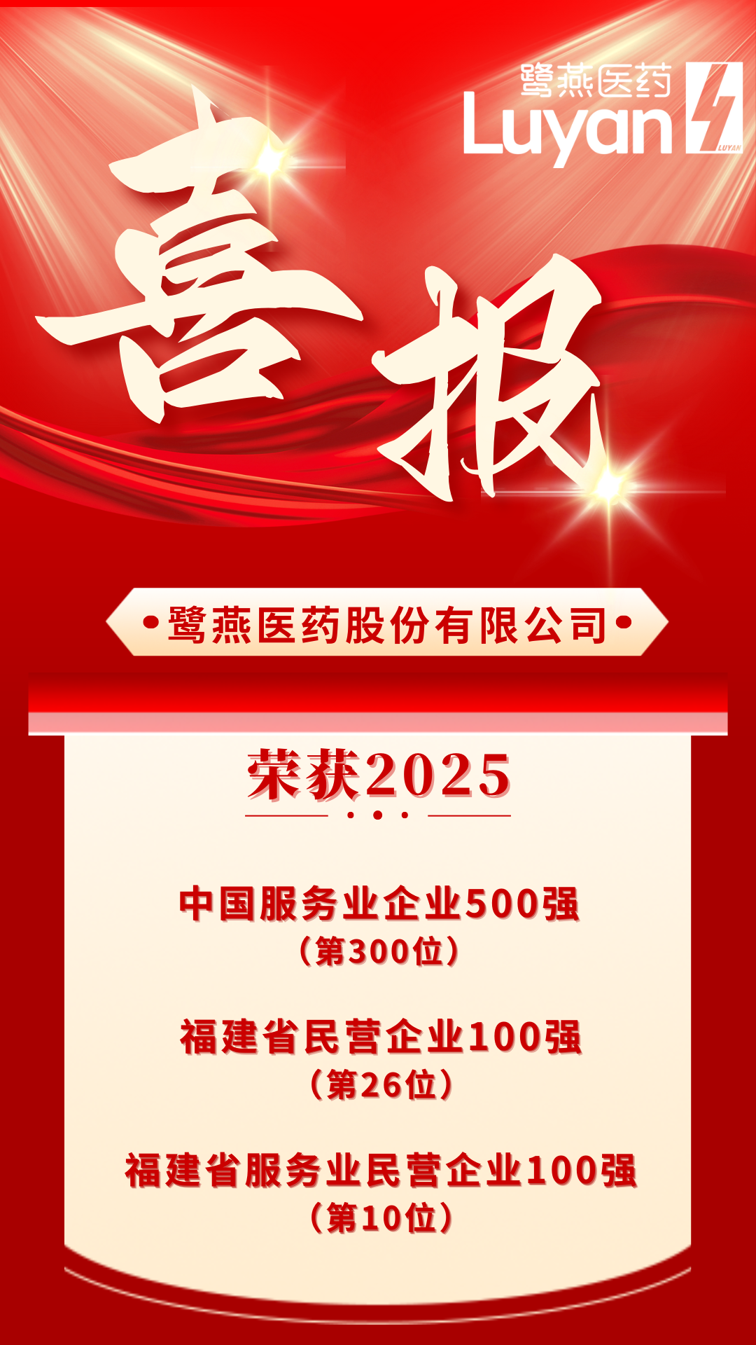 9月28日,福建省工商業聯合會在寧德發布“2025福建民營企業100強”,鷺燕醫藥連續5年上榜,列第26位。同時,在“2025福建省服務業民營企業100強”榜單上,鷺燕醫藥連續3年上榜,位居第10位。