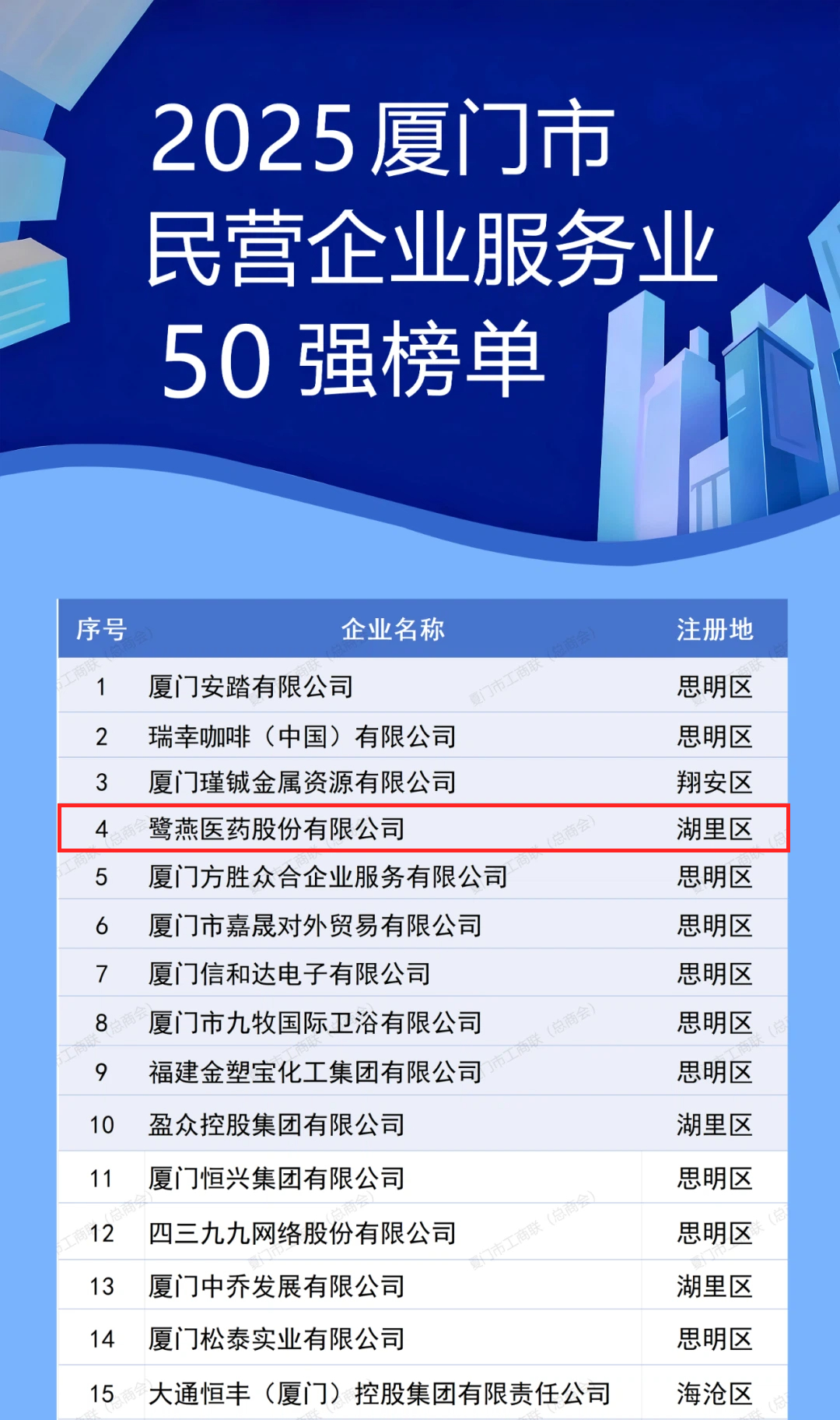 11月1日上午,2025年廈門企業家日大會召開。大會發布了2025廈門市民營企業100強系列榜單,介紹了廈門市民營經濟發展態勢和營商環境建設成效。鷺燕醫藥股份有限公司憑借上市企業綜合實力,榮膺“2025廈門市民營企業100強”第6位,以及“2025廈門市民營企業服務業50強”第4位。
